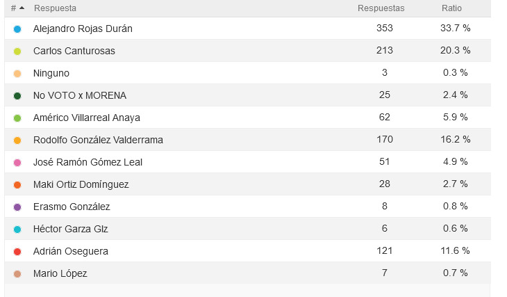 Bajo la variable “¿Quién cree usted que debería de ser el candidato de Morena a la gubernatura de Tamaulipas?”, de un total de 1,047 personas que participaron, el 33.7 por ciento indicó que debería de ser Alejandro Rojas Díaz Durán.