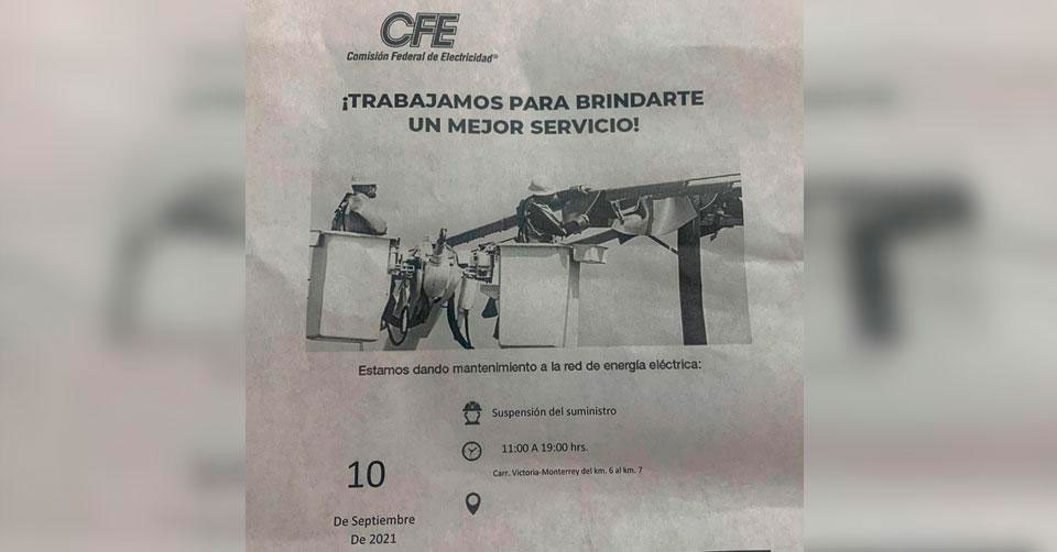 Ciudad Victoria, Tamaulipas. - Los habitantes de las inmediaciones del kilómetro seis al siete de la carretera Ciudad Victoria – Monterrey, se quedarán sin luz por un periodo de siete horas mañana viernes, informó la Comisión Federal de Electricidad (CFE).