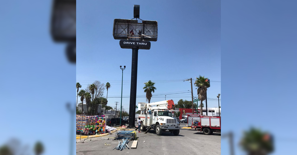 Nuevo Laredo, Tamaulipas. - Dos hombres quedaron atrapados en el panorámico de un restaurante de comida rápida en Nuevo Laredo y otro resultó lesionado al caer cuando se derrumbó el andamio en el que presuntamente iban trepando.