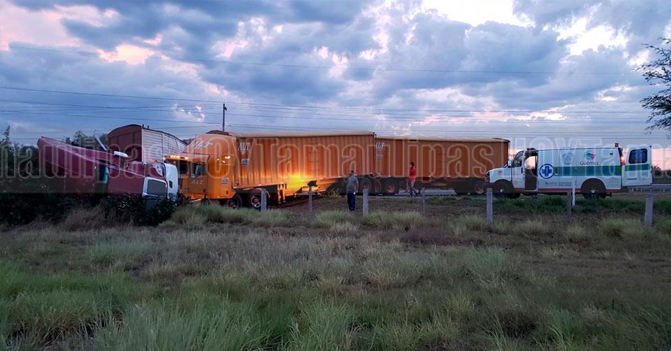 Ciudad Victoria, Tamaulipas. - Un choque con volcadura entre dos pesadas unidades dejó como saldo un chofer lesionado y cuantiosos daños materiales esta tarde, en el kilómetro 15 de la carretera Victoria-Matamoros.