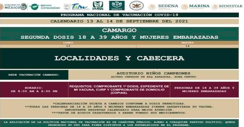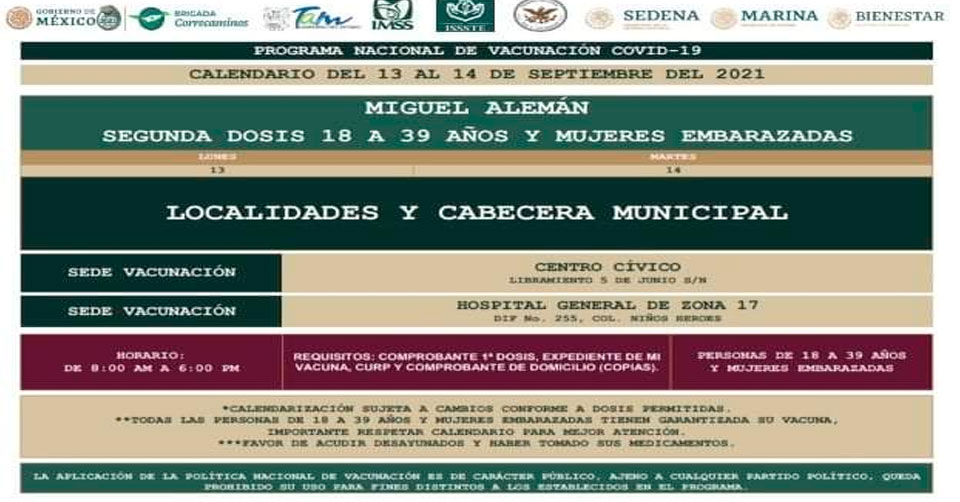 Ciudad Victoria, Tamaulipas. - La aplicación de la segunda dosis de la vacuna antiCovid en los municipios de la frontera chica de Tamaulipas iniciará el lunes 13 de septiembre, informó el delegado de los Programas Federales para el Desarrollo, José Ramón Gómez Leal.