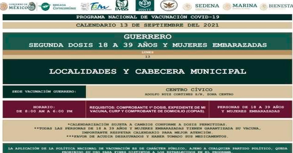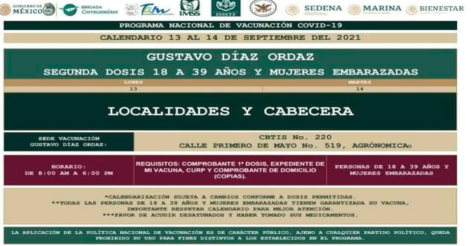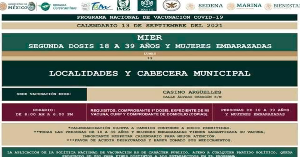 Dijo que se les estará aplicando la vacuna Pfizer y recordó que deberán llevar una copia de su CURP y un comprobante de domicilio. Asimismo, presentar el expediente de vacunación que pueden obtener en la página https://mivacuna.salud.gob.mx/index.php