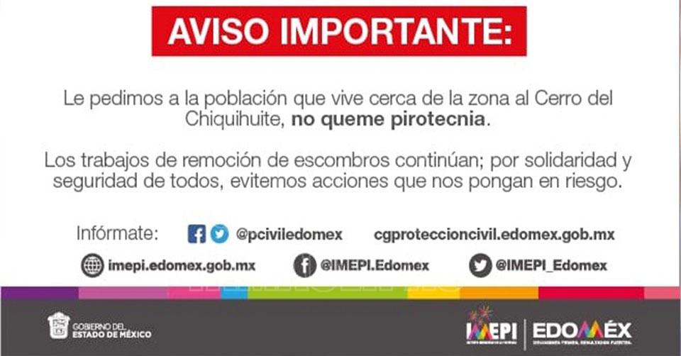 Tlalnepantla, Edomex., (Agencia Informativa de México).- En plenas fiestas patrias la Coordinación de Protección Civil del Estado de México hizo un llamado a los vecinos de la colonia Lázaro Cárdenas la Presa en Tlanepantla, para o detonar pirotecnia, cuetes o cohetones, para evitar que las vibraciones puedan remover las rocas y se generen nuevos deslizamientos.
