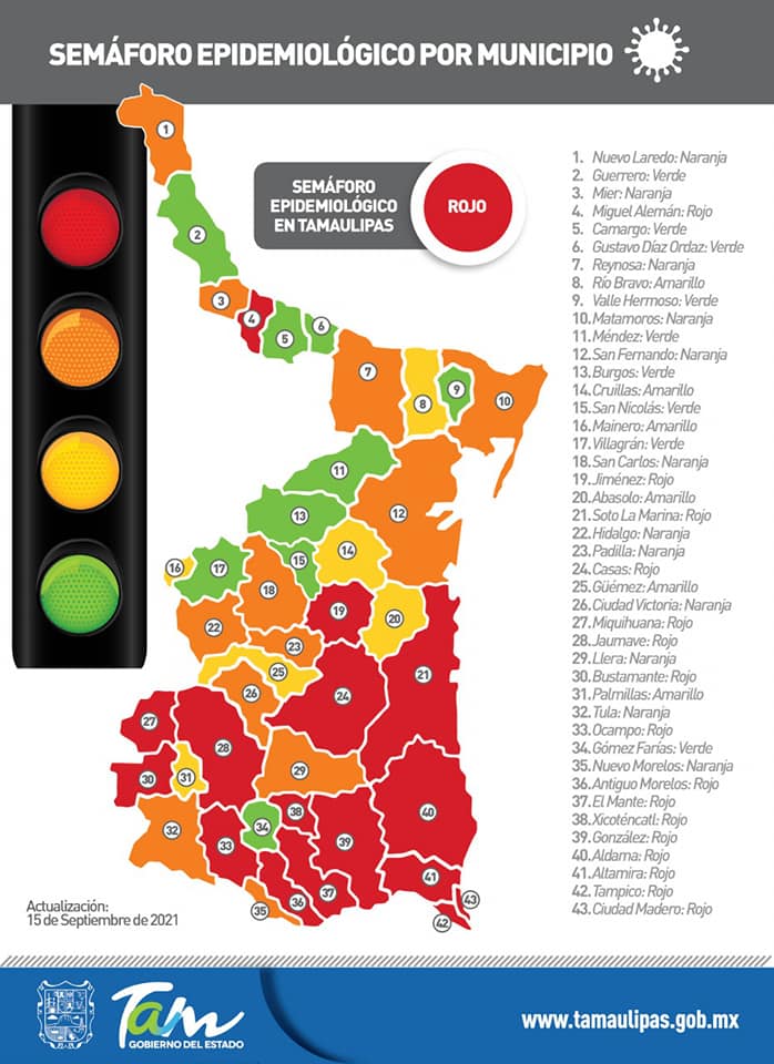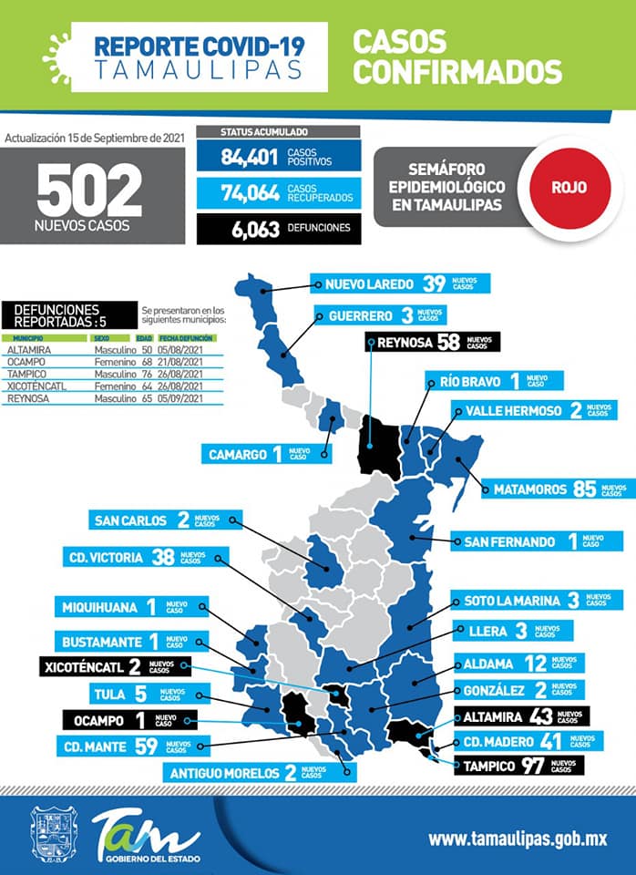 Ciudad Victoria, Tamaulipas. - Un total de 502 nuevos casos y cinco muertes por complicaciones derivadas del Covid-19 se registraron este miércoles 15 de septiembre en Tamaulipas, informó la Secretaría de Salud del Estado.