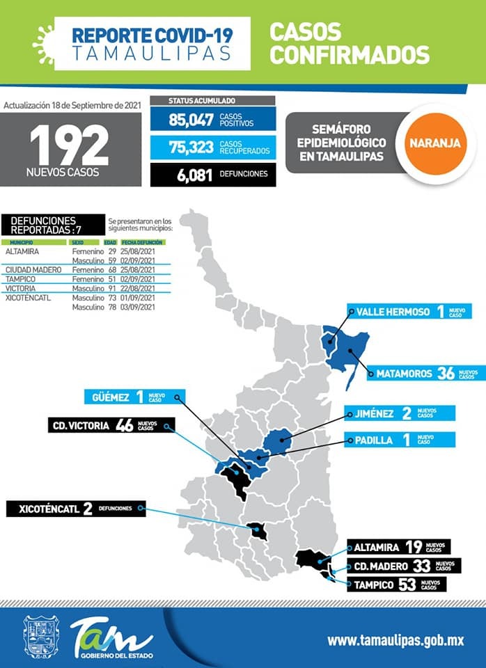 Ciudad Victoria, Tamaulipas.- Un total de 192 casos de Covid-19 y siete muertes por complicaciones de la enfermedad confirmó hoy la Secretaría de Salud de Tamaulipas.