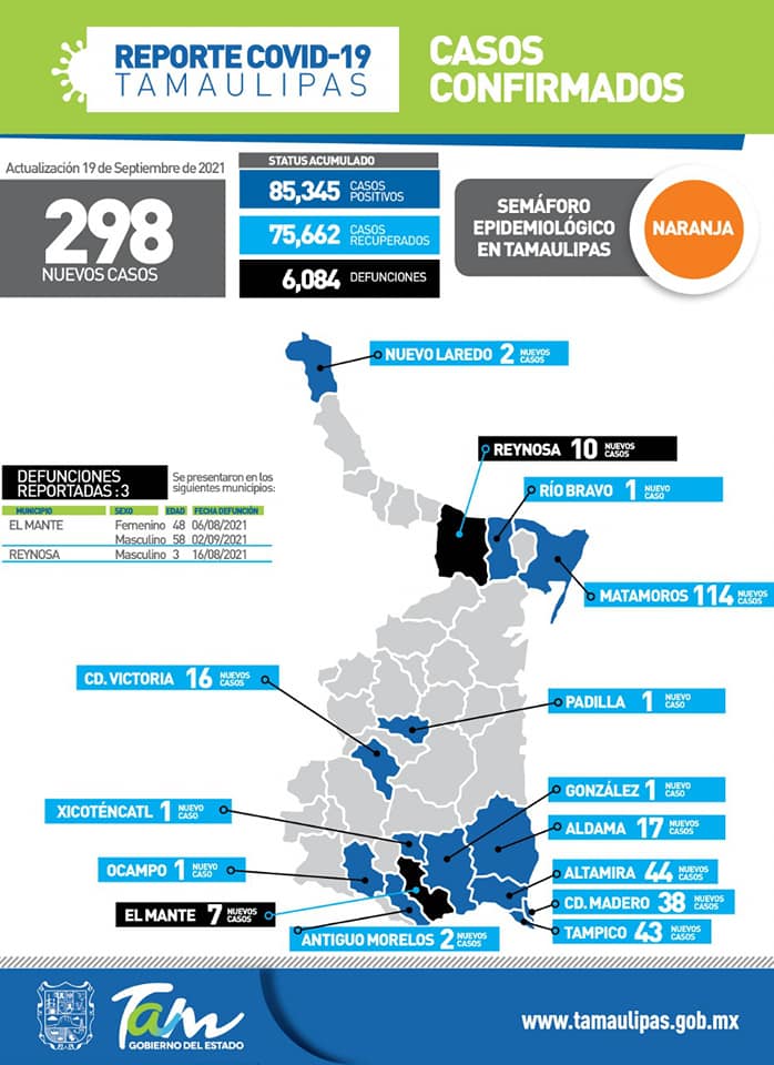 Ciudad Victoria, Tamaulipas.- Un total de 298 nuevos contagios de Covid-19 y tres muertes a causa de la enfermedad, entre ellos un menor de tres años, confirmó hoy la Secretaría de Salud de Tamaulipas; Matamoros encabezó la lista de nuevos contagios con 114 registrados.