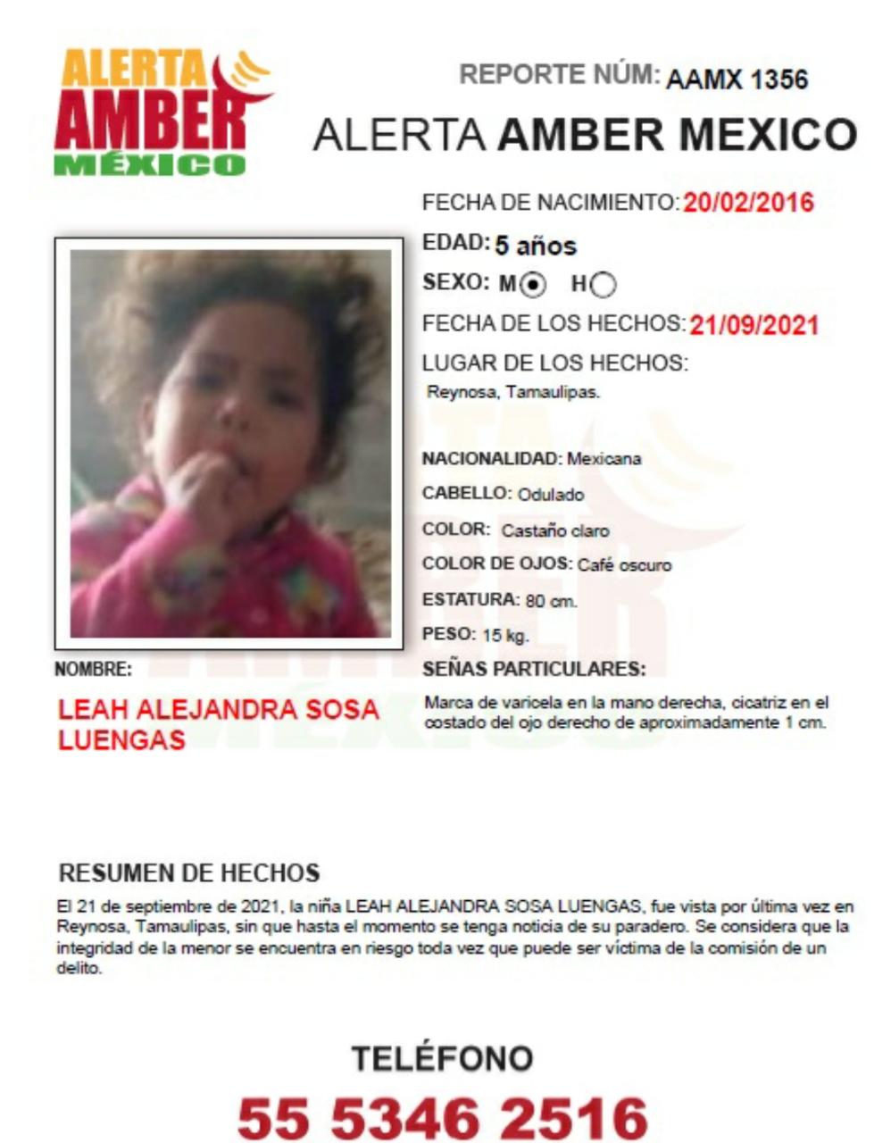 “El 21 de septiembre de 2021, la niña Leah Alejandra Sosa Luengas fue vista por última vez en Reynosa, Tamaulipas, sin que hasta el momento se tenga noticia de su paradero. Se considera que la integridad de la menor se encuentra en riesgo toda vez que puede ser víctima de la comisión de un delito”, informaron las autoridades mediante la Alerta Amber con número de reporte AAMX 1356.