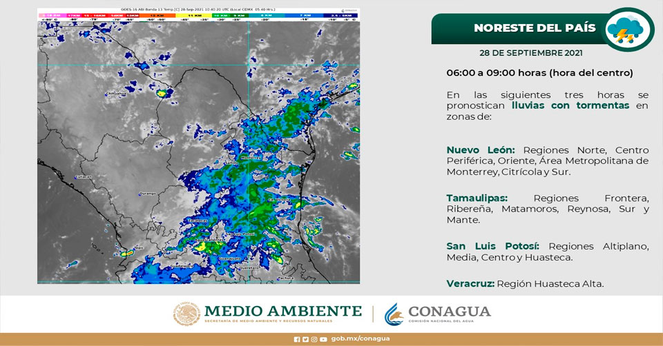 “Las lluvias podrían acompañarse de descargas eléctricas, vientos fuertes y caída de granizo que podrían generar deslaves e inundaciones, así como viento con rachas de 50 a 60 km/h: Chihuahua, Coahuila, Nuevo León y Tamaulipas”, precisa el aviso del SMN.