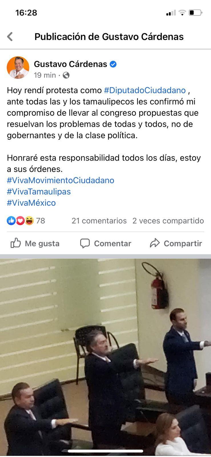 Ciudad Victoria, Tamaulipas.- Luego de que rindió protesta como diputado local por la vía plurinominal, el congresista Gustavo Cárdenas Gutiérrez subió a sus redes sociales algunas imágenes y un mensaje al respecto.