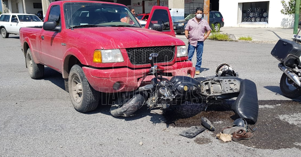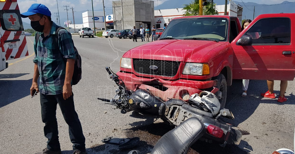 Ciudad Victoria, Tamaulipas. - Un motociclista resultó lesionado luego de que fuera impactado por una camioneta Ford Ranger donde viajaba un joven repartidor de tortillas en Ciudad Victoria.