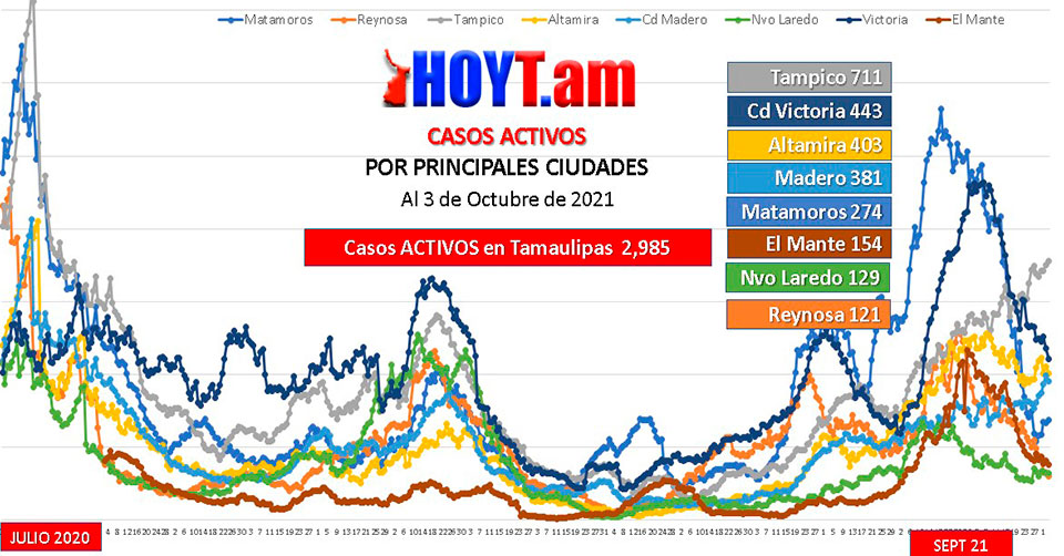 De acuerdo al Portal de Coronavirus del Gobierno del Estado son los municipios de Tampico y Victoria los que más casos activos tienen con 711 y 443 casos, respectivamente.