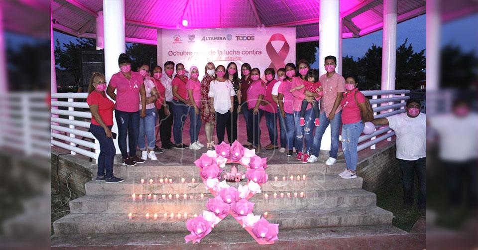 Altamira, Tamaulipas. - La presidenta del Sistema DIF Altamira, la señora Rosa Irma Luque de Martínez, presidió la caravana del mes de la Lucha Contra el Cáncer de Mama en Villa Cuauhtémoc, en la plaza principal donde encendió una luz de esperanza y se colocó un listón rosa en reconocimiento a las mujeres valientes que enfrentan esta sensible enfermedad.