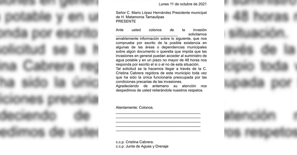 Matamoros, Tamaulipas. - Un documento se ha difundido a través de redes sociales, en donde habitantes invasores mediante la regidora integrante del movimiento 20/32, Cristina Cabrera Flores, está queriendo meter presión al alcalde Mario Alberto López Hernández, para que les dé una respuesta sobre la introducción de agua y drenaje en los sectores invadidos.