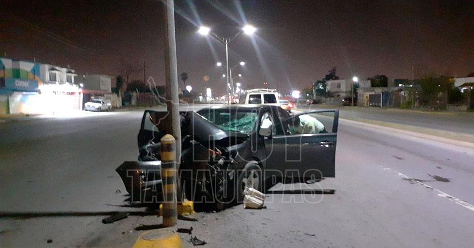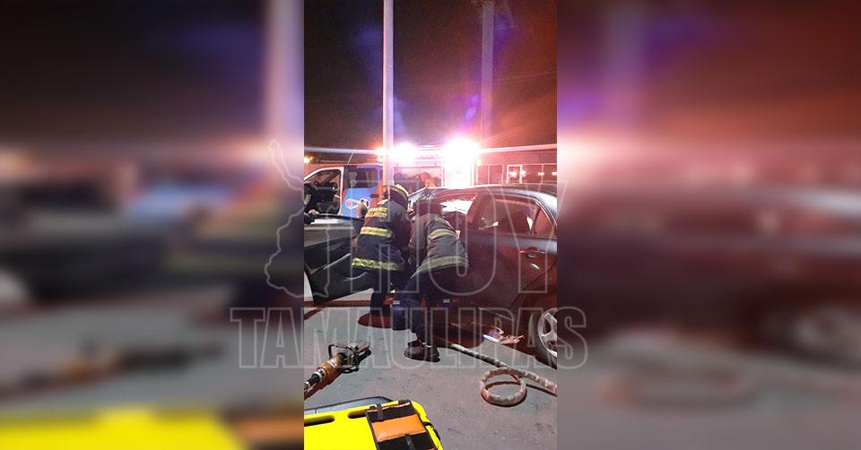 Nuevo Laredo, Tamaulipas. - Un hombre quedó atrapado y seriamente lesionado dentro de su vehículo, tras chocar contra un poste de alumbrado público en la Calzada de Los Héroes, al poniente de Nuevo Laredo.