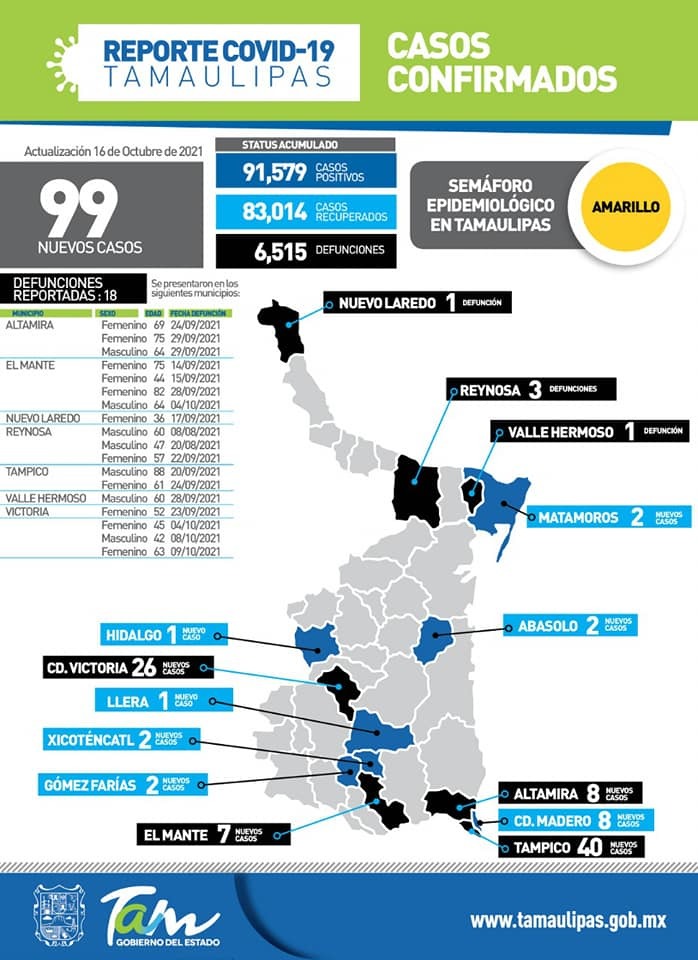 Da “tregua” el Covid-19 en Tamaulipas; reporta Salud 99 contagios y 18 fallecimientos