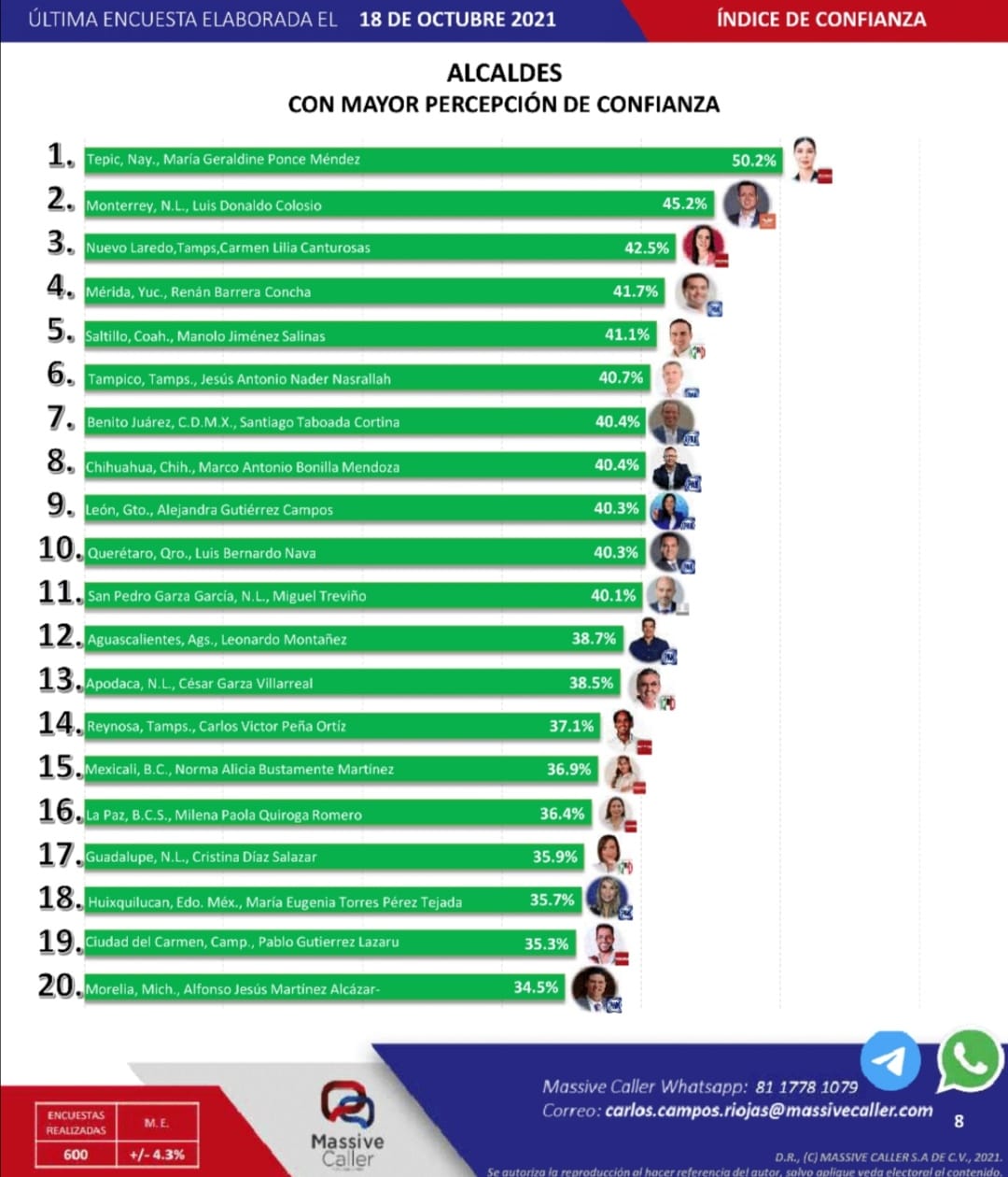 Esta encuesta, realizada por una de las más importantes y serias encuestadoras, publicada el 18 de octubre del 2021, ubica a la alcaldesa de Nuevo Laredo, Carmen Lilia Canturosas, en el tercer lugar entre los alcaldes que generan mayor percepción de confianza entre los habitantes de su municipio.