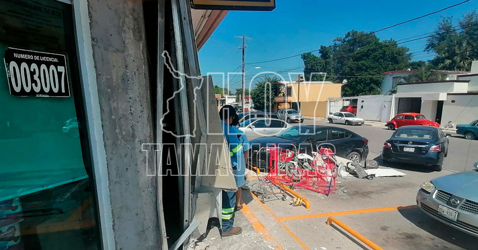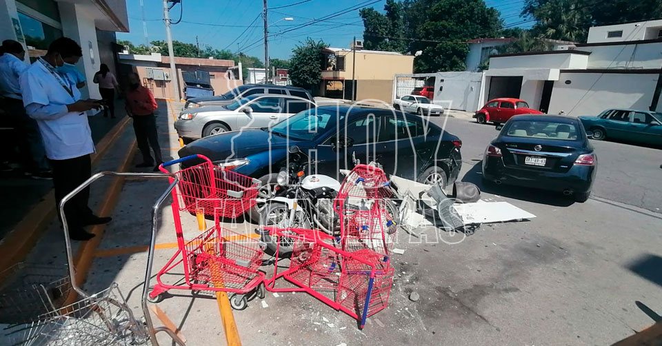 Confunde freno con el acelerador y choca contra carros, moto y farmacia en Ciudad Victoria