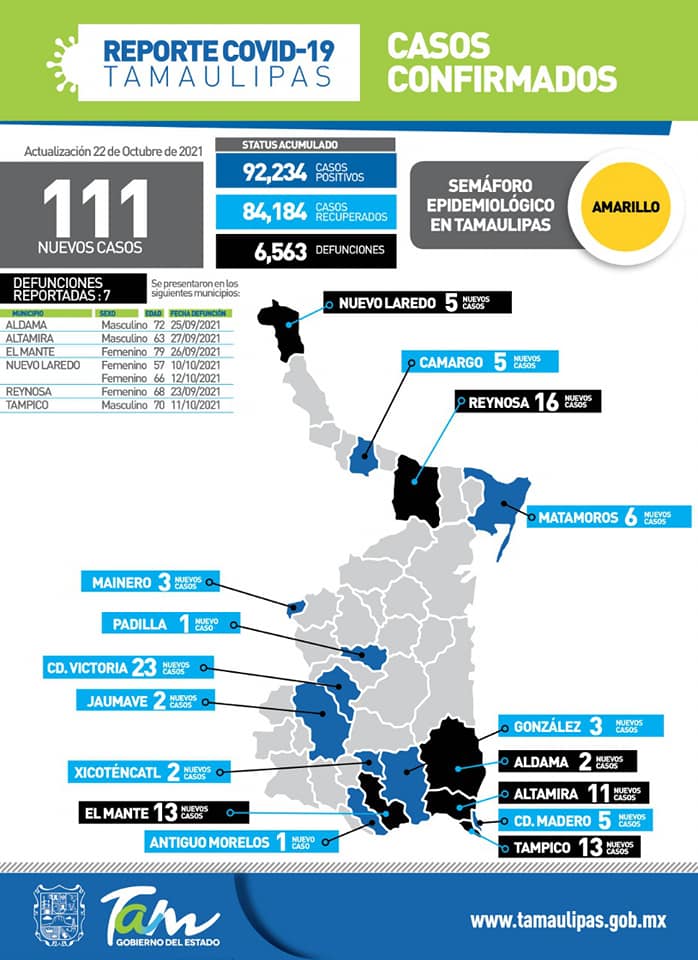 Ciudad Victoria, Tamaulipas.- Un total de 111 nuevos casos de Covid-19 y siete muertes por complicaciones derivadas de la enfermedad se registraron este viernes en Tamaulipas, confirmó hoy la Secretaría de Salud del Estado.