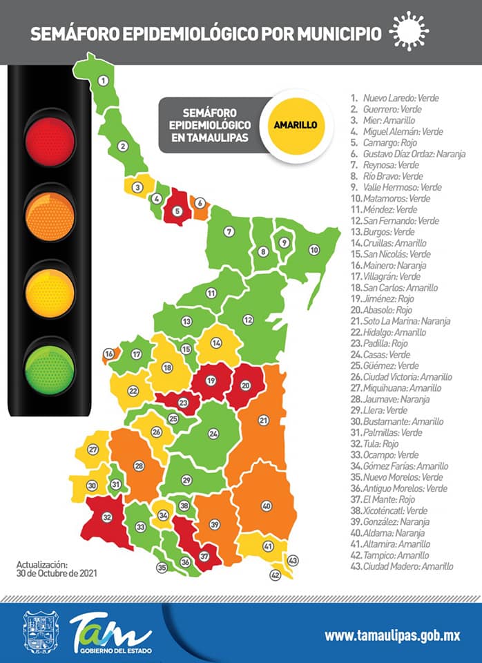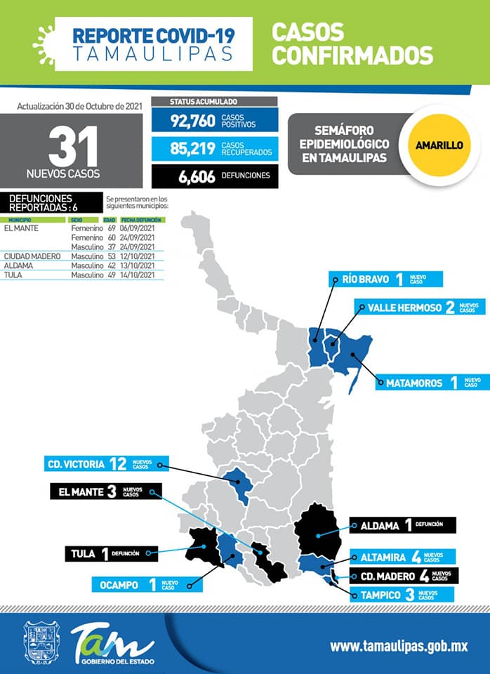 Ciudad Victoria, Tamaulipas.- Tan solo 31 nuevos casos de Covid-19 y seis fallecimientos por complicaciones derivadas de la enfermedad se registraron este sábado 30 de octubre en Tamaulipas, confirmó la Secretaría de Salud Estatal (SST).