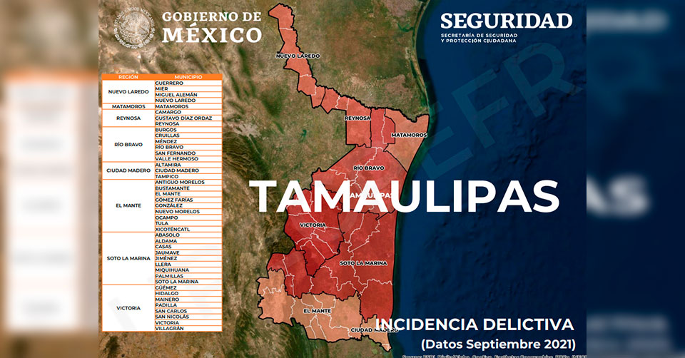 Las cifras del Secretariado Ejecutivo del Sistema Nacional de Seguridad Pública ubican a Tamaulipas con una importante disminución en los diversos indicadores de seguridad respecto a la media nacional y con una considerable reducción desde el año 2018 al 2021.