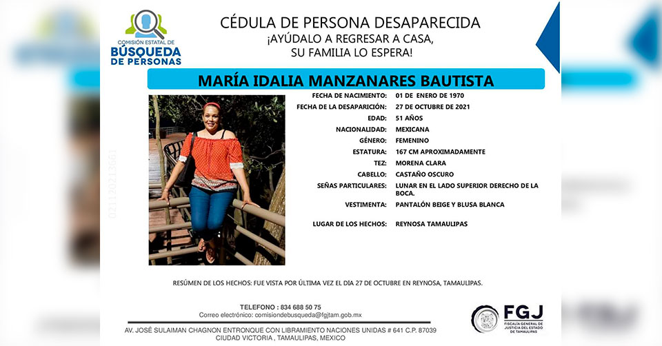 Reynosa, Tamaulipas.- La Comisión Estatal de Búsqueda de Personas en Tamaulipas confirmó esta noche la desaparición del exdiputado local Ulises Martínez Trejo y su esposa María Idalia Manzanares Bautista.