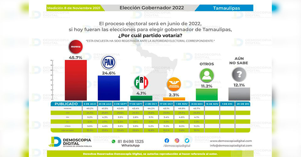 Cabe señalar que Demoscopia Digital realiza estudios mensuales de evaluación sobre las preferencias electorales de los estados que vivirán elecciones el próximo año y los hace públicos, y está registrada ante los órganos electorales.