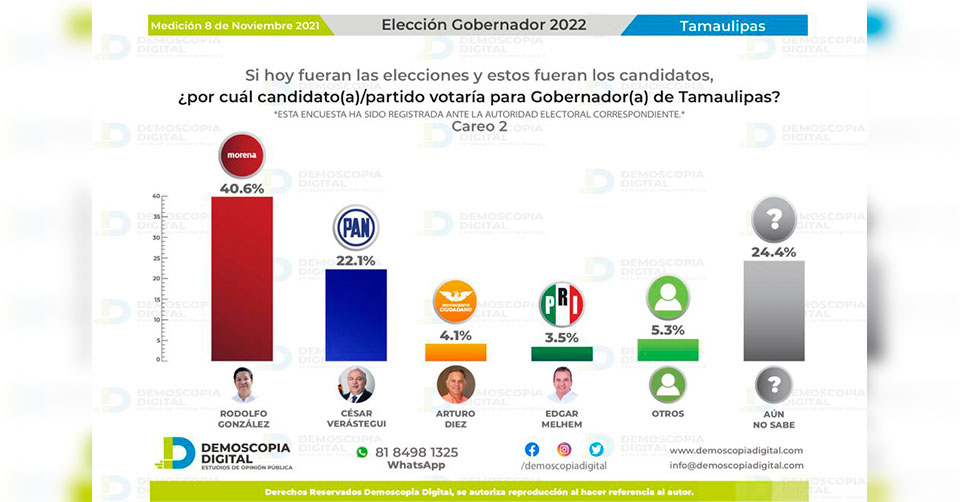 Ciudad de México. - De cara a las elecciones de seis gobernadores en México, un estudio de opinión pública presentado por Demoscopia Digital, prevé el triunfo de MORENA en 5 estados del país, destacando Tamaulipas, donde el aspirante moreno mejor posicionado y con mayor ventaja ante rivales de otros partidos es Rodolfo González Valderrama.