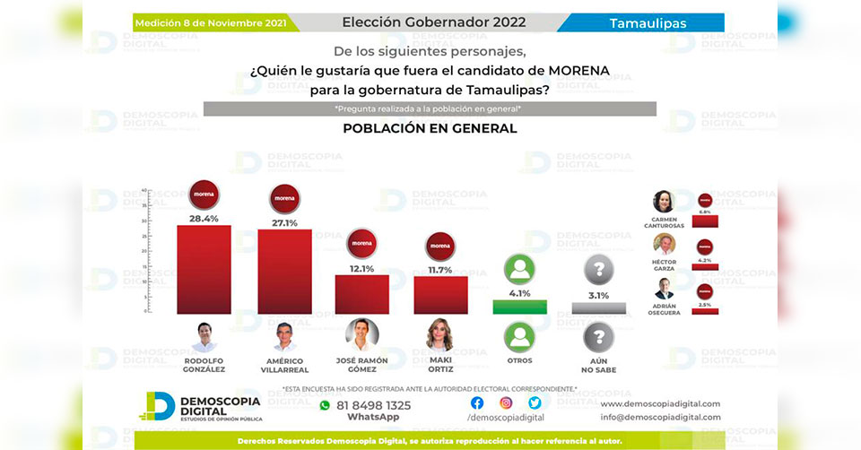Sobre los aspirantes de MORENA la candidatura a gobernador, el tampiqueño Rodolfo González Valderrama, es quien registra la mejor aceptación entre militantes y simpatizantes de ese partido, así como entre la población tamaulipeca en general.