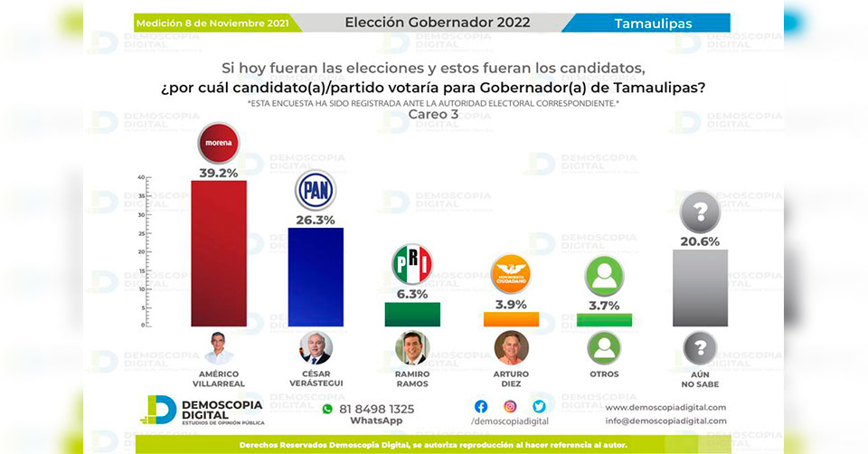 Supera en aceptación desde 1.3 a más de 20 puntos a otros aspirantes como el victorense Américo Villarreal Anaya, a los reynosenses José Ramón Gómez Leal, Maki Ortíz Domínguez y Héctor Garza González, la neolaredense Carmen Lilia Cantú Rosas o el maderense Adrián Oseguera.