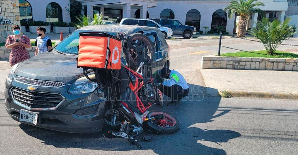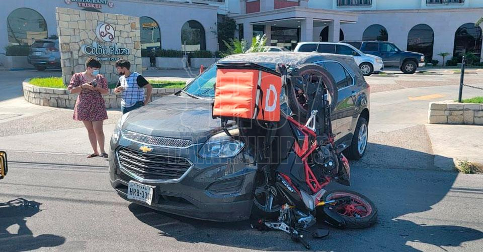 Nuevo Laredo, Tamaulipas. - Un motociclista resultó lesionado esta tarde al estrellarse contra una camioneta, cuya conductora salió con vía libre del estacionamiento de un conocido hotel de Nuevo Laredo.
