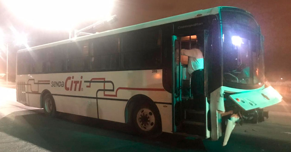 El accidente se registró en el cruce con el Bulevar Emilio Madero, frente a la colonia 150 Aniversario, en el sector poniente, viéndose afectados en éste los pasajeros de un camión de transporte de personal de la empresa Senda City.