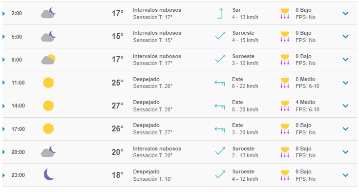 Según el pronóstico del clima marcado en Meteored este día se esperan temperaturas máximas de 18 grados y mínimas de 14, siendo un día soleado con pocos intervalos lluviosos.