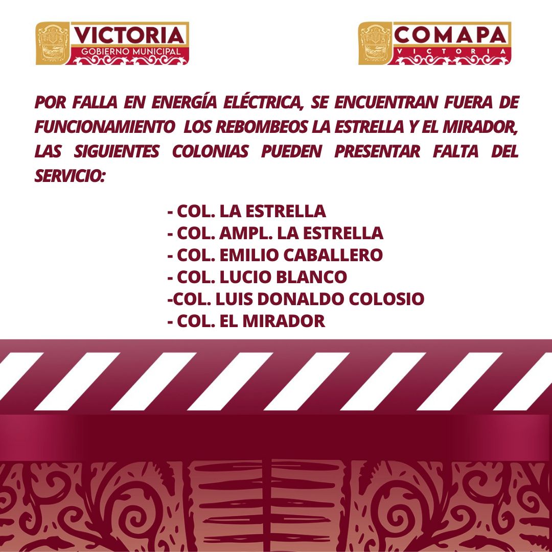 Ciudad Victoria, Tamaulipas. - Una falla en la energía eléctrica afectó los rebombeos La Estrella y el Mirador, por lo que algunas colonias no cuentan con el servicio del vital líquido, informó la Comisión Municipal de Agua Potable y Alcantarillado (Comapa) de Ciudad Victoria.