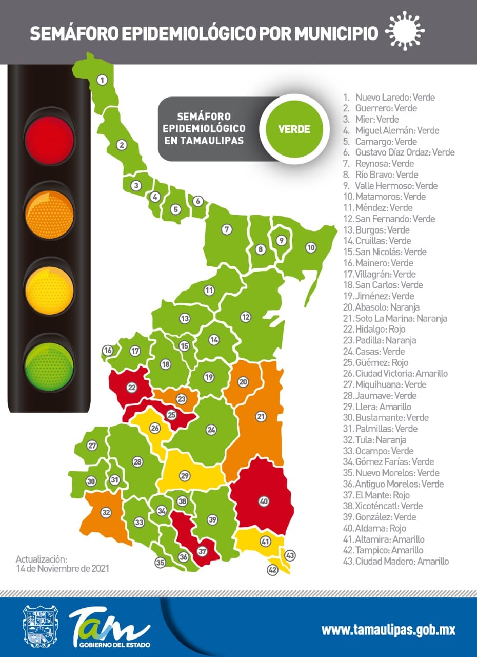 La secretaria de Salud de Tamaulipas, Gloria Molina Gamboa, recordó que Tamaulipas se encuentra en semáforo de riesgo epidemiológico color verde ante el descenso en los casos, hospitalizaciones y defunciones, sin embargo, insistió en seguir reforzando las medidas de prevención como si estuviéramos en riesgo elevado para avanzar hacia la nueva normalidad y la convivencia segura.