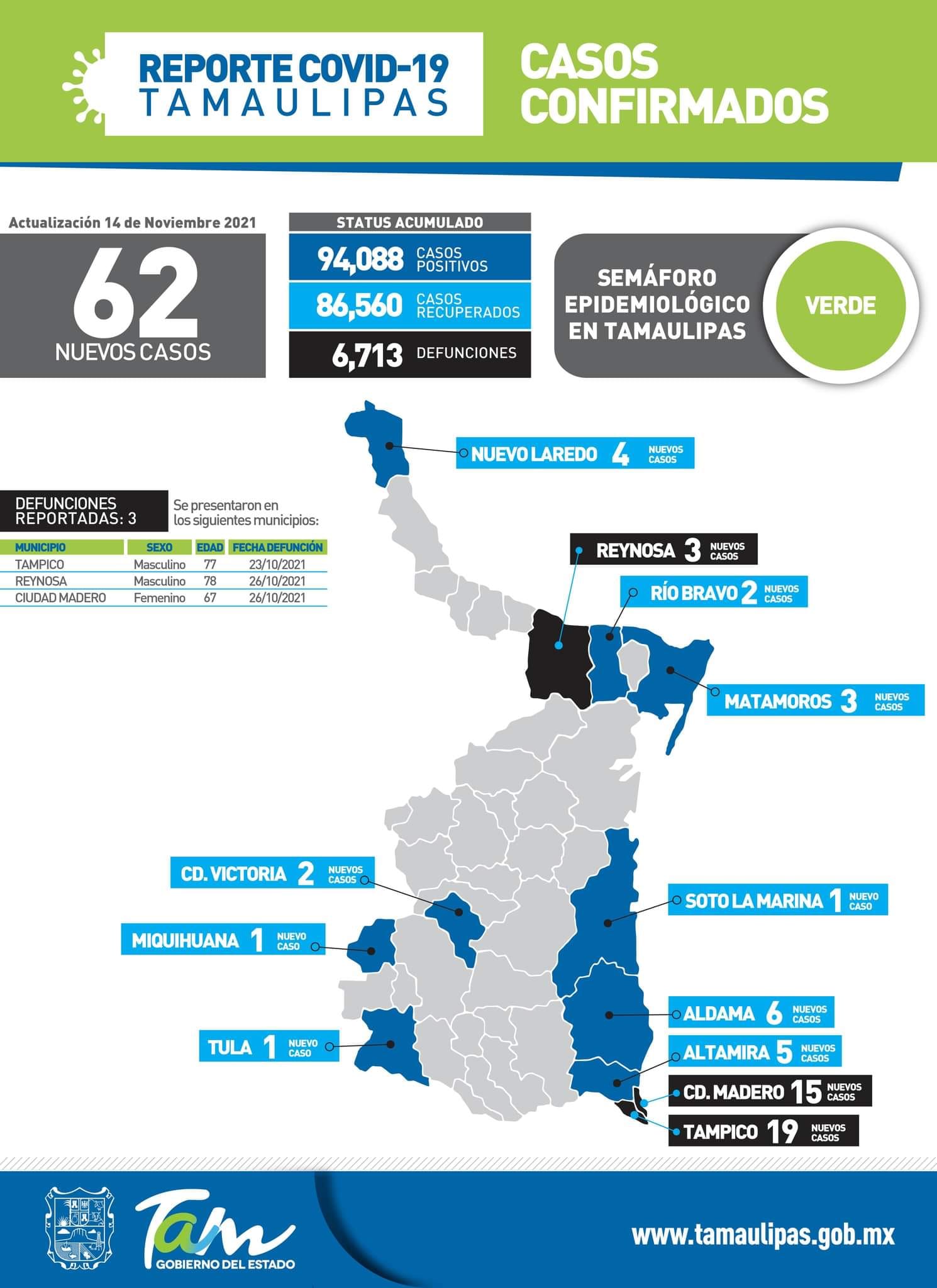 Mientras que las muertes corresponden a un hombre de 77 años en Tampico, un hombre de 78 años en Reynosa y una mujer de 67 años en Ciudad Madero.
