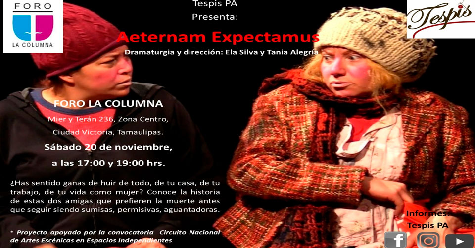 De esta manera, el sábado 20 de noviembre, a las 17:00 y 19:00 h, el grupo Tespis PA nos trae la historia “Aeternam expectamus”, farsa tragicómica para adolescentes y adultos, creada y representada por Ela Silva y Tania Alegría, quienes dan vida a un par de mujeres que prefieren la muerte antes que seguir siendo sumisas, permisivas, aguantadoras, y que mientras permanecen en eterna espera, hacen señalamientos a la educación convencional, al núcleo familiar, las creencias religiosas, el abuso del poder y la falta de empatía de la sociedad que las hunde y también las señala.