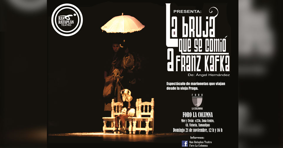 Por su parte el domingo 21, con funciones a las 12:00 y 16:00 h para toda la familia, llega desde el vecino puerto de Tampico el grupo Ran Rataplán con la obra de Títeres “La bruja que se comió a Franza Kafka”, de Ángel Hernández, historia que narra las aventuras de Sodja, una bruja que busca entre sus más antiguos libros la fórmula para cumplir su más anhelado sueño: convertirse en una gran escritora.