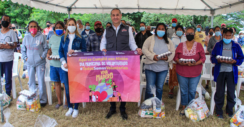 Durante la actividad del Día Municipal de Servicio Voluntario 2021, el edil maderense y la primera dama, además, hicieron entrega de despensa a los habitantes del margen del Río Pánuco y convivieron con niños y niñas que padecen cáncer.