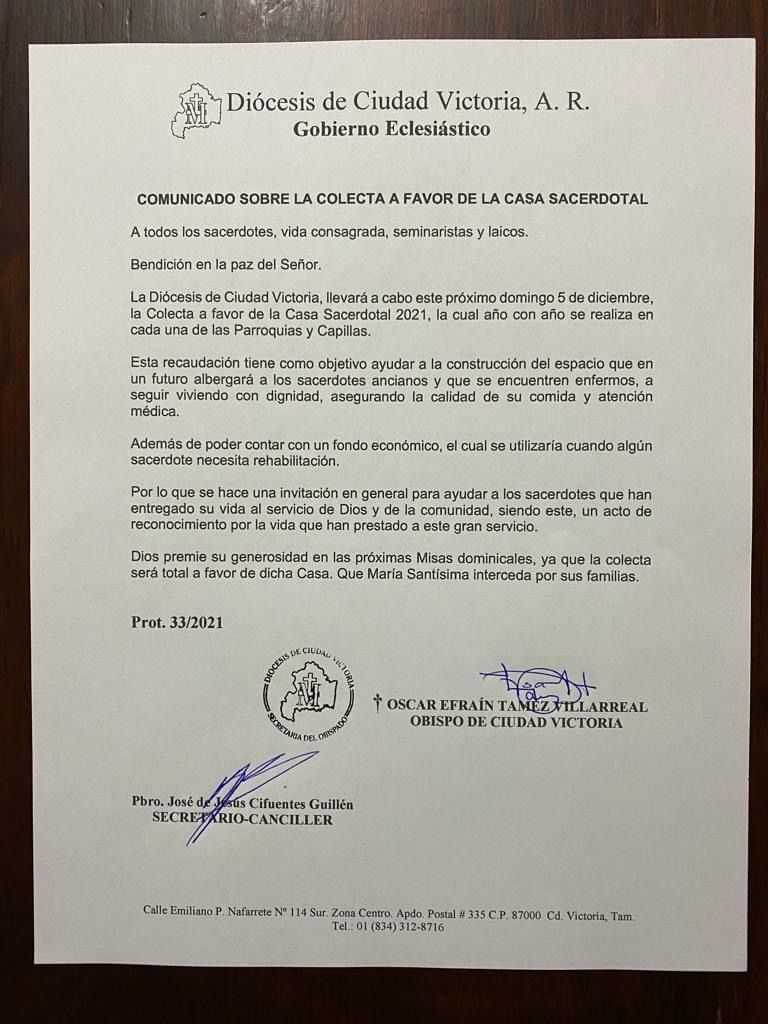 “Por lo que se hace una invitación en general para ayudar a los sacerdotes que han entregado su vida al servicio de Dios y de la comunidad, siendo este, un acto de reconocimiento por la vida que han prestado a este gran servicio”, indicó el comunicado brindado por el obispo Óscar Efraín Tamez Villarreal.