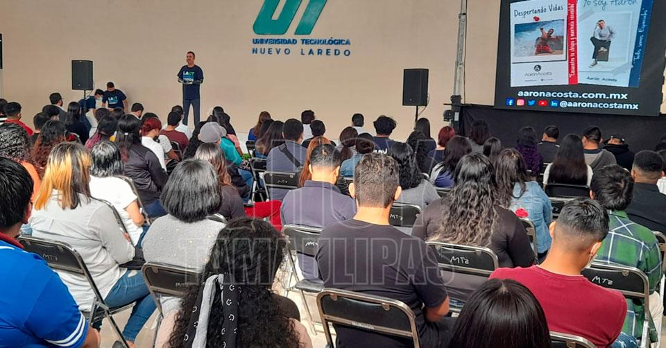 Nuevo Laredo, Tamaulipas. - Jóvenes estudiantes de la Universidad Tecnológica de Nuevo Laredo (UTNL) recibieron una muy interesante plática de superación personal por parte del conferencista Aarón Acosta que los visitó directamente en su plantel, como parte de la gira de presentaciones que hizo a esta ciudad fronteriza.