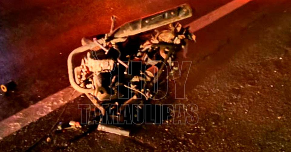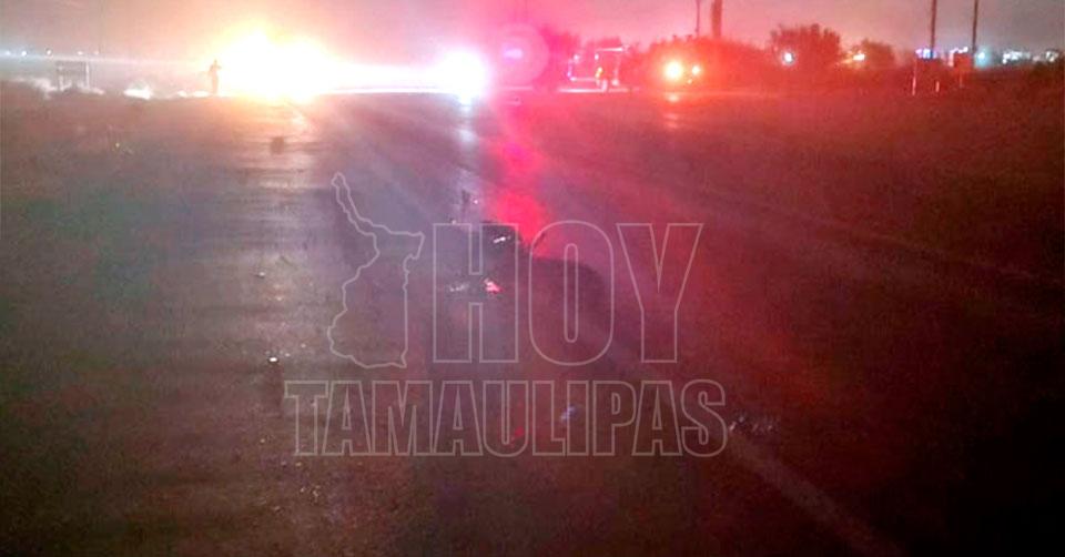 Reynosa, Tamaulipas. - Dos personas de sexo masculino perdieron la vida esta madrugada, luego de que la moto en la que viajaban fue brutalmente impactada por varios vehículos en la carretera a San Fernando, a la altura de la colonia Valle Soleado en Reynosa.