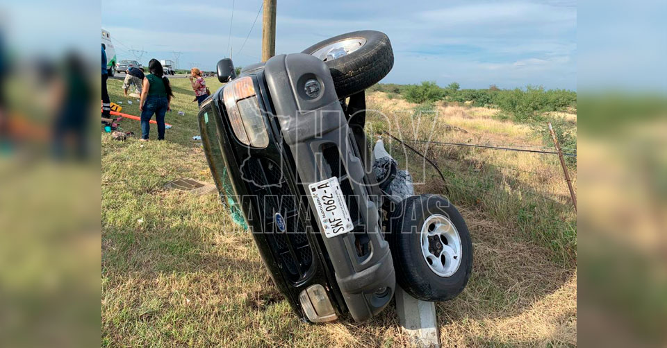 Ciudad Victoria, Tamaulipas. - Ocho integrantes de una familia resultaron lesionados esta tarde, tras volcar y chocar contra un poste de concreto la camioneta en la que viajaban, a la altura del kilómetro 54 de la carretera Zaragoza-Victoria.