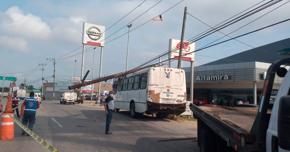 Choca autobús urbano y tumba poste de la CFE en Altamira