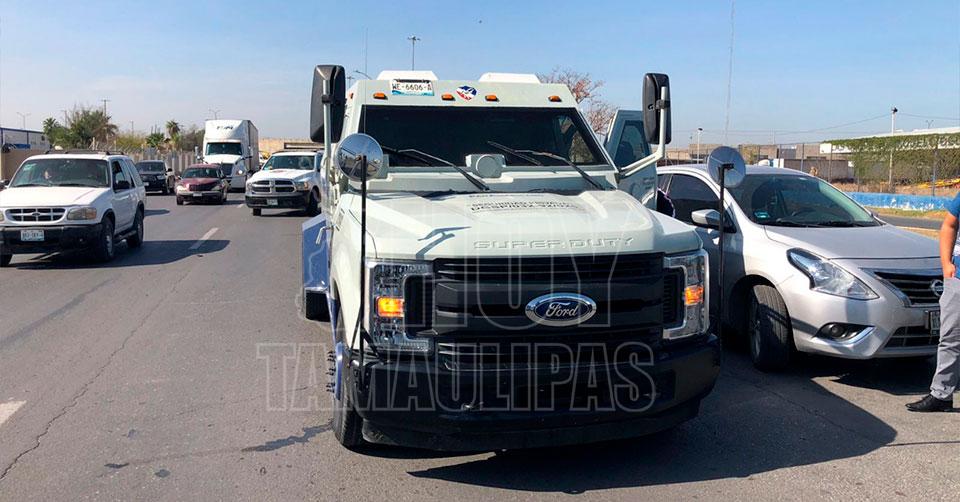 Nuevo Laredo, Tamaulipas.- Daños materiales de consideración dejó un accidente vial entre un camión de valores y un automóvil en el Bulevar Colosio, al sur de Nuevo Laredo.