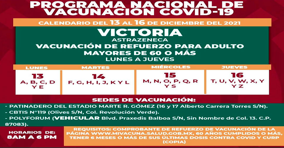 Ciudad Victoria, Tamaulipas. – La vacunación antiCovid-19 tercera dosis para adultos mayores de 60 años en Ciudad Victoria iniciará este lunes y su aplicación será en orden alfabético en los módulos de “el Patinadero, el CBTis 119 y el “Drive Thru” en el estacionamiento del Polyforum, informó el delegado de los Programas Federales para el Desarrollo, Rodolfo González Valderrama.