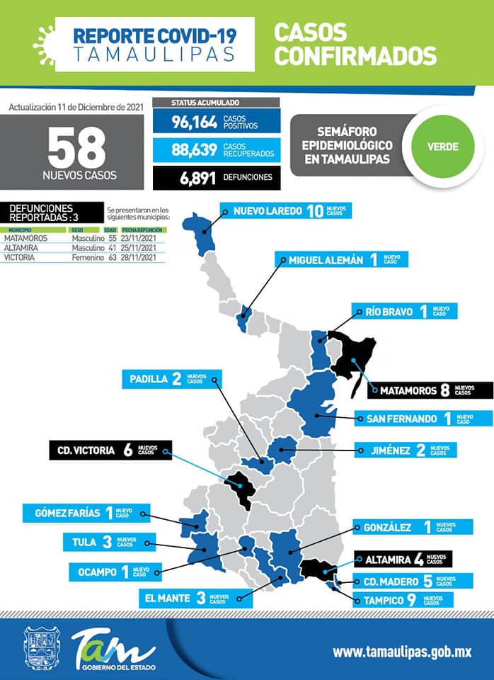 Ciudad Victoria, Tamaulipas.- Un total de 58 nuevos contagios de Covid-19 y tres muertes por complicaciones derivadas de la enfermedad se registraron este sábado en Tamaulipas, informó la Secretaría de Salud del Estado.