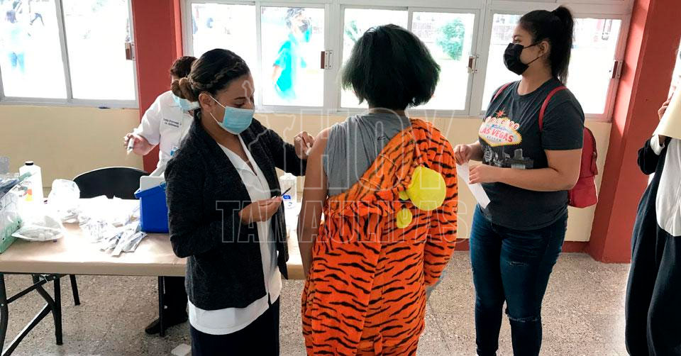 Matamoros, Tamaulipas. - Vestidas de “panda” y “tigre”, dos gemelas llegaron hasta las instalaciones del Tecnológico de Matamoros para aplicarse la vacuna contra la Covid-19, durante el primer día de inmunización contra esta enfermedad para los jóvenes de 15 a 17 años de edad.
