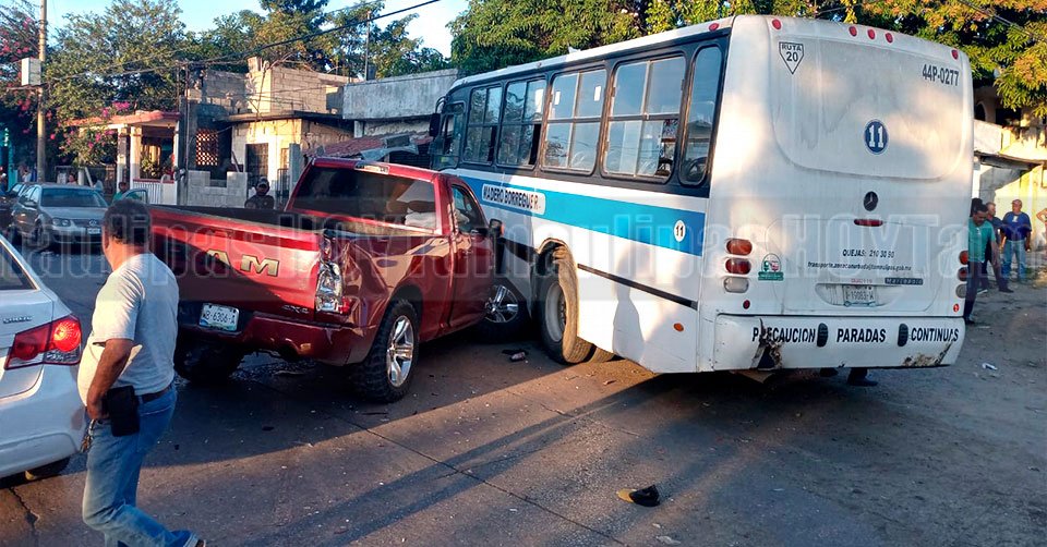 Personal de vialidad que tomó conocimiento de los hechos, destacó que el choque se produjo cuando el conductor de una camioneta Dodge Ram color rojo tipo pick-up, impactó en un costado al microbús de la ruta Madero-Borreguera.
