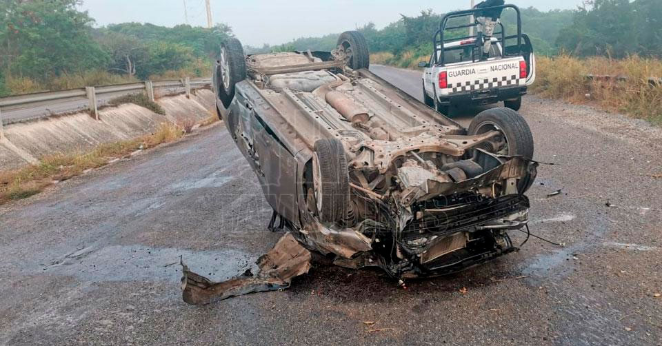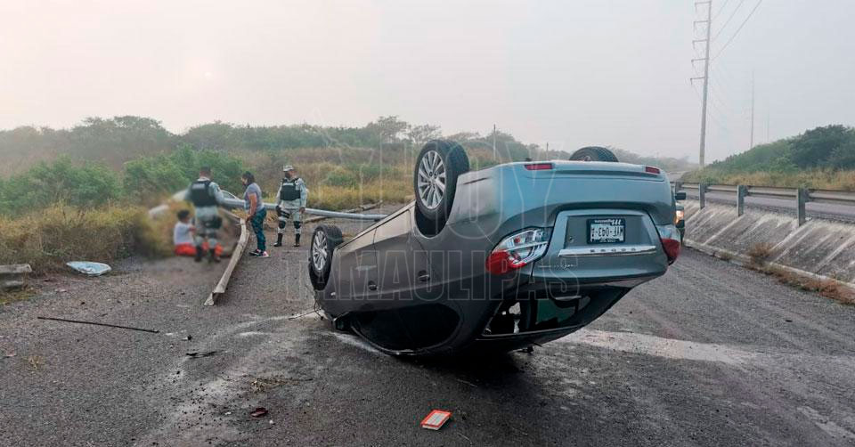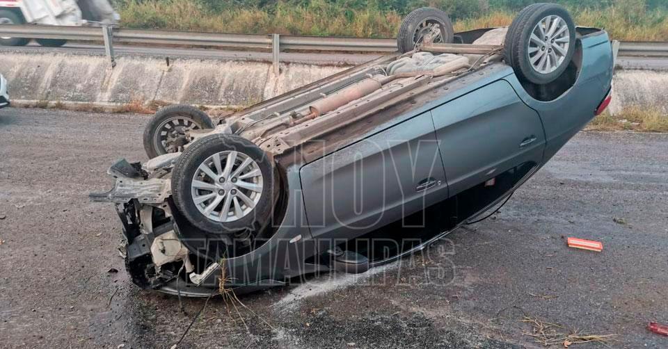 El percance ocurrió a la altura de "la Virgen" en el municipio de Altamira, punto en el que quedó llantas arriba y destrozada de la parte frontal una unidad Dodge color gris.