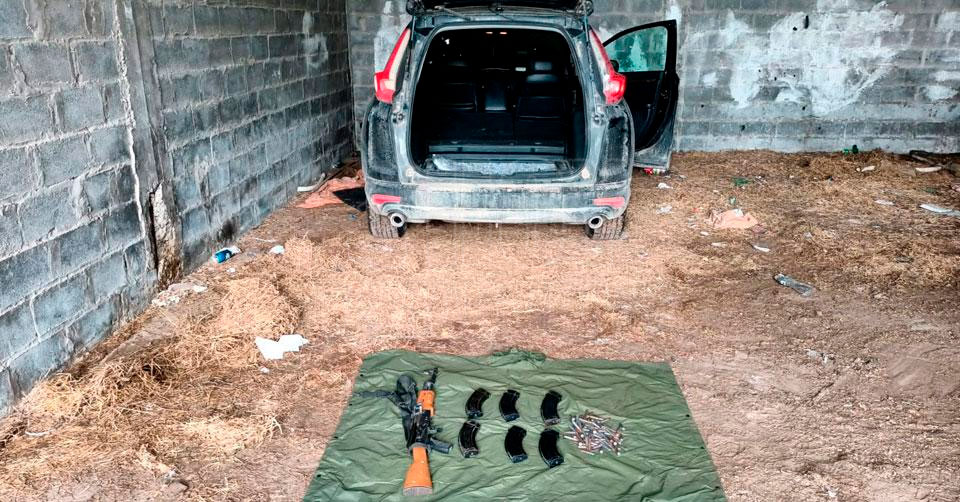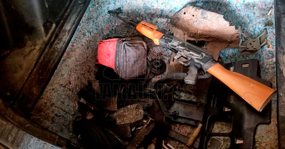 Díaz Ordaz, Tamaulipas. - Elementos del Ejército Mexicano aseguraron un arsenal y una camioneta abandonados en una bodega, ubicada en un camino de tercería que comunica con la localidad del Tepehuaje en el municipio de Gustavo Díaz Ordaz.